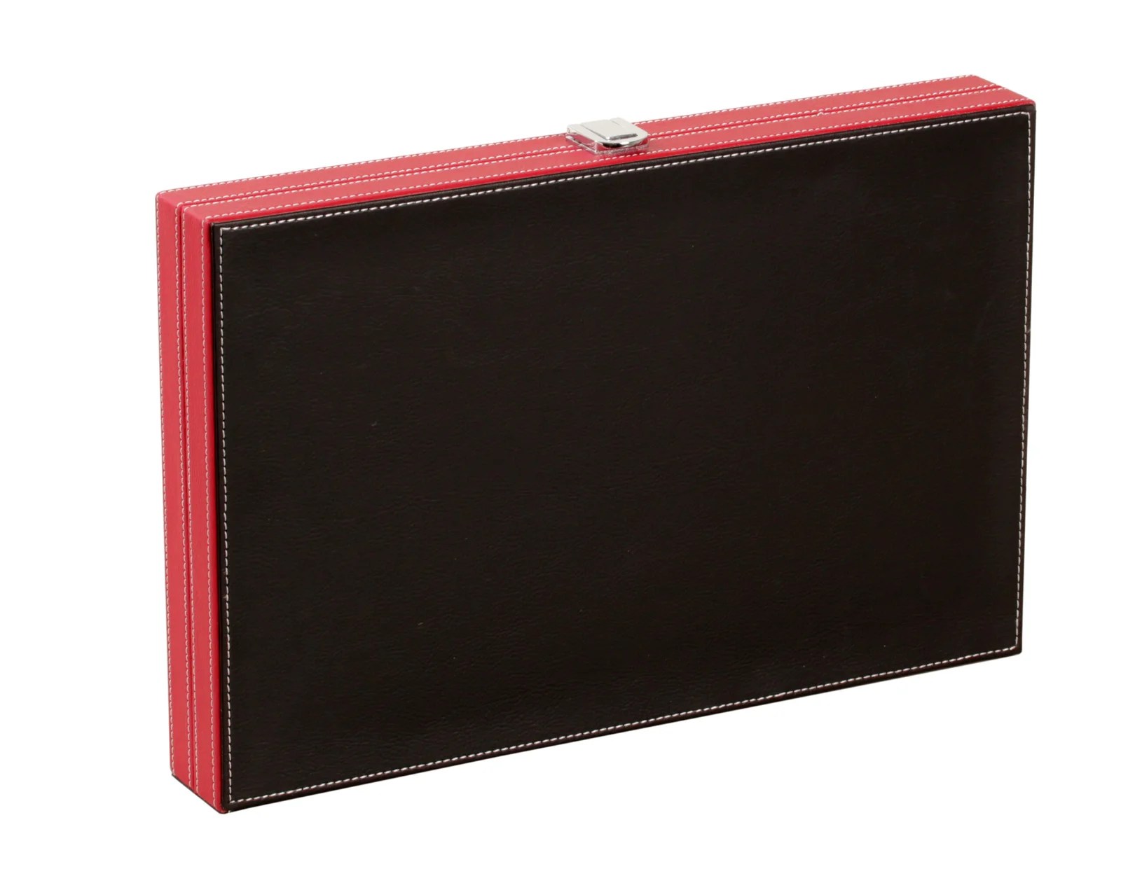 15″ black & red leatherette backgammon with color matching sewn in points velour interior. Includes black and red playing pieces, two sets of color matching dice, two dice cups and one doubling cube.